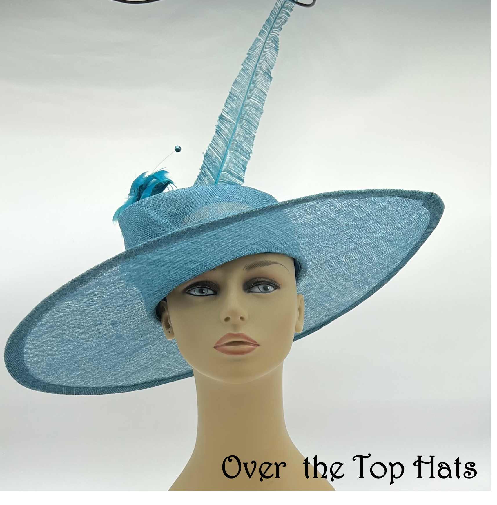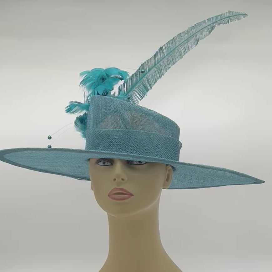 Beautiful Teal Big Brimmed Hat with Asymmetrical Crown and Feathers, Great for Derby, Steeple Chase, Garden Party or Special Occasion