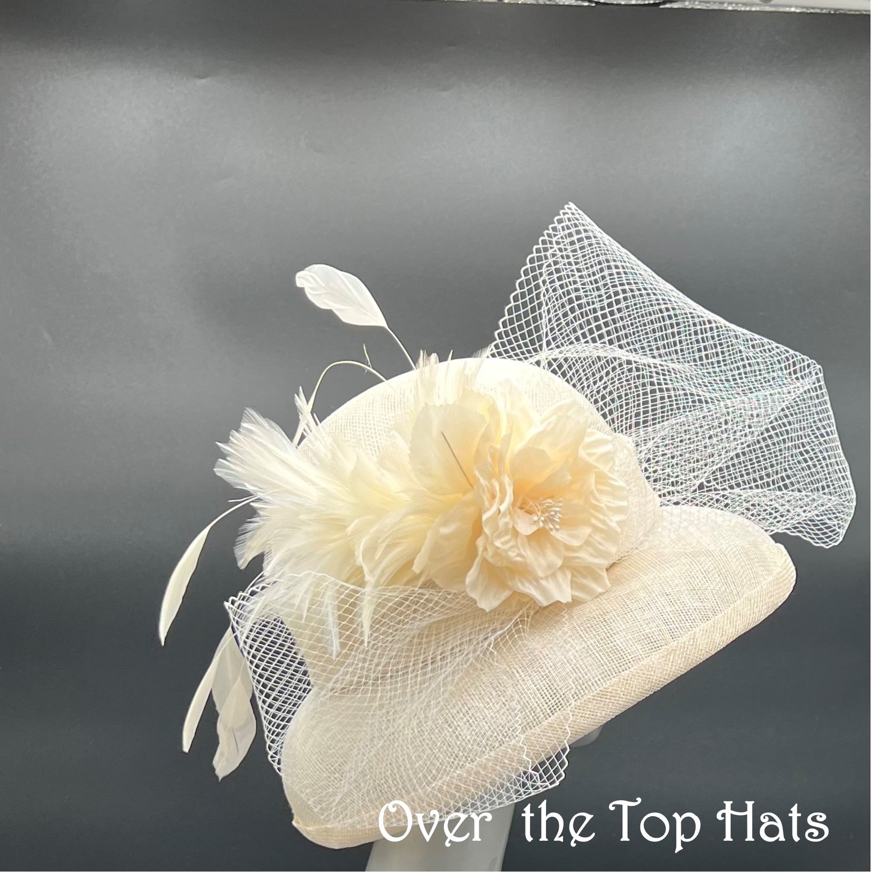 Ivory Hat with Domed Brim, Vintage Veiling, Feathers and Flower